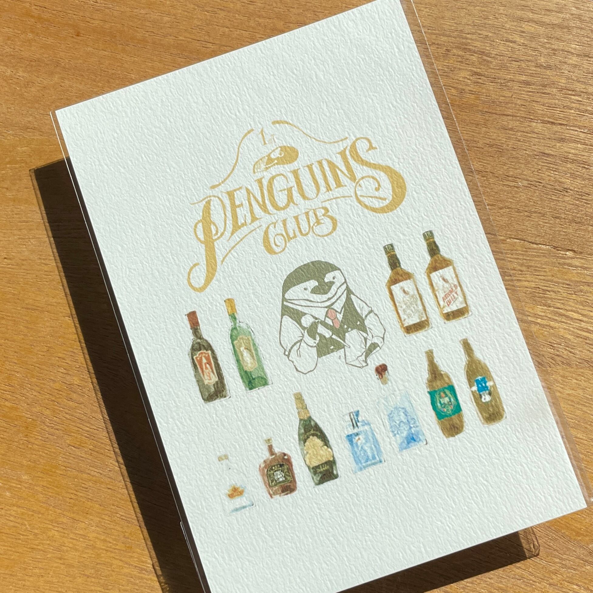 (ファーストペンギンズクラブ)のバーテンダーさんと取り扱いのあるお酒ブランドの瓶が描かれたポストカードとなります。