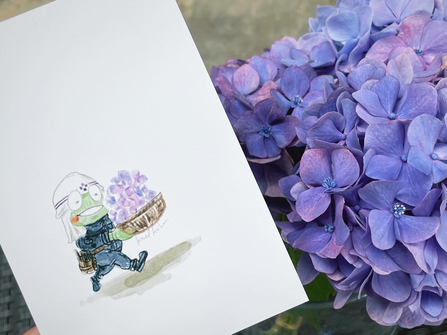 地面が酸性かアルカリ性かによって、できる紫陽花の色が紫だったり、青だったり、ピンクだったりしてたら楽しいなあと想像しながら描きました。